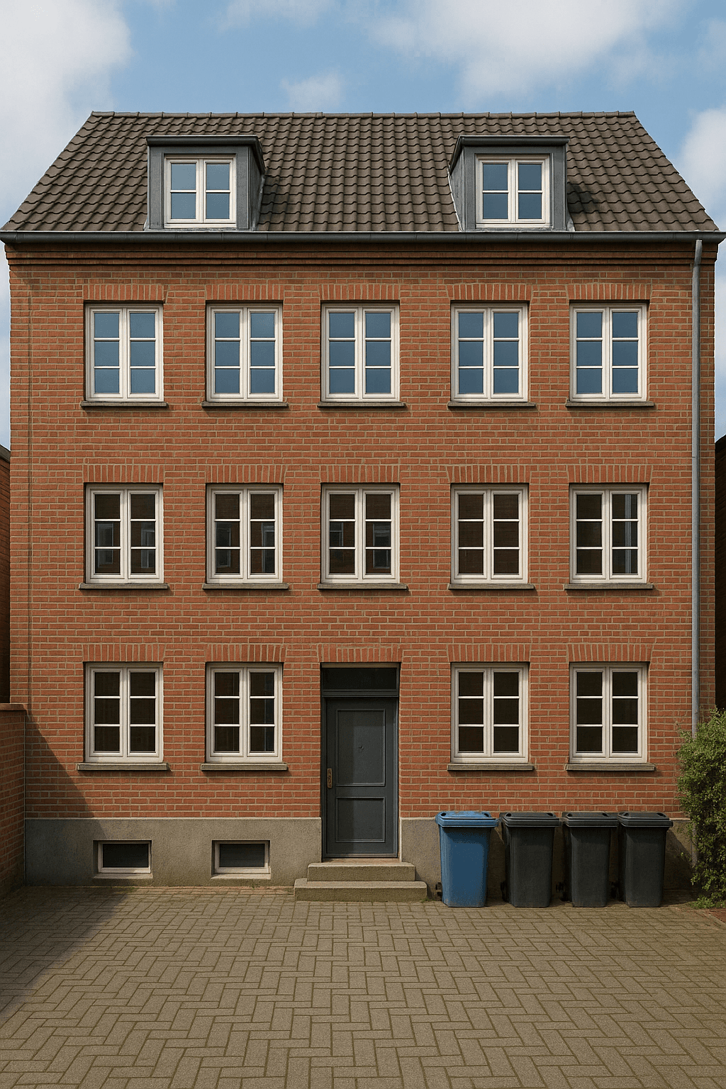 Bilderstellung | „Erstell ein Bild von einem Haus" | „Erstelle ein Bild, ein Mehrfamilienhaus mit roter Klinkerfassade, 3 Etagen, davor ein kleiner Hof mit Mülltonnen" |