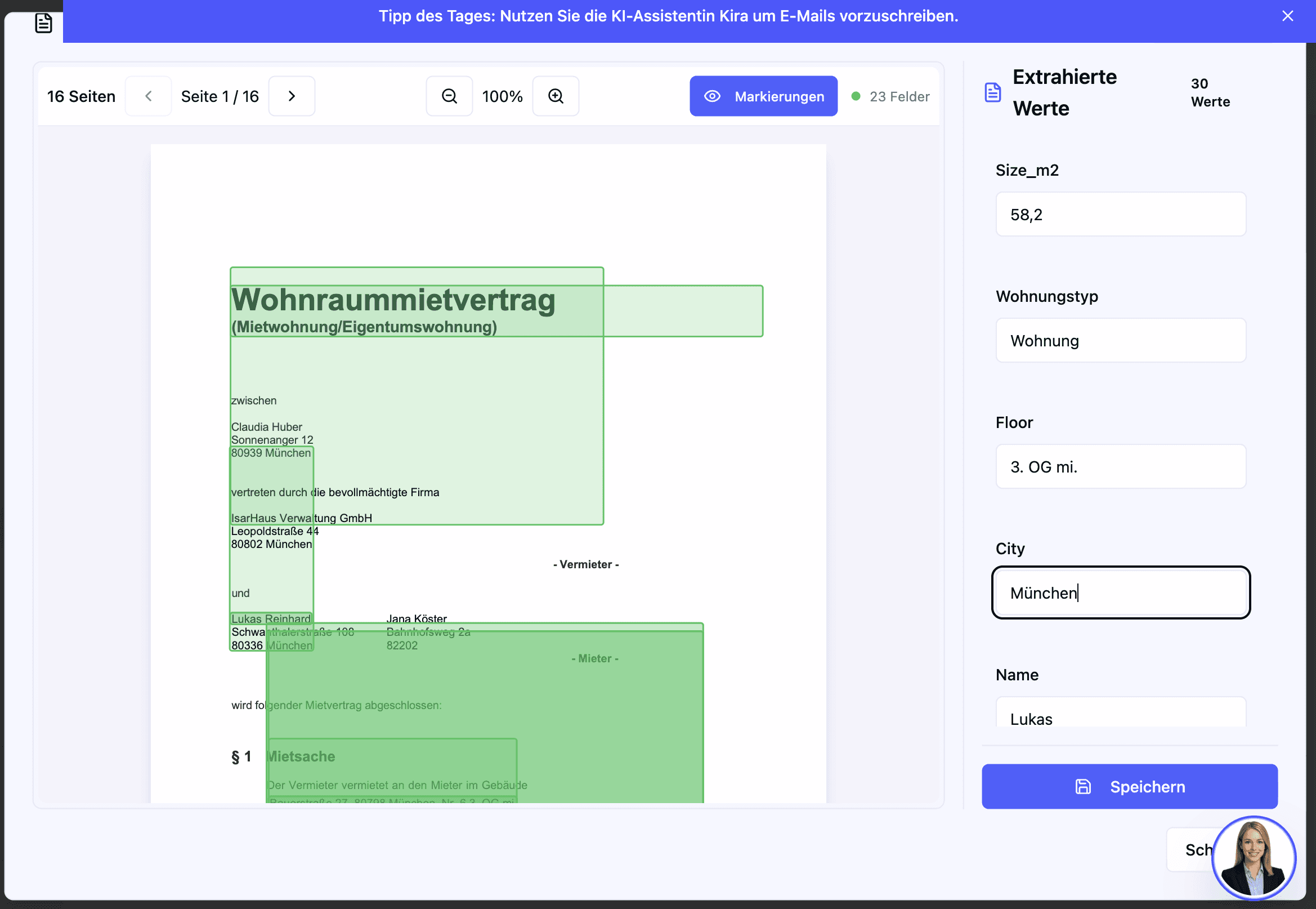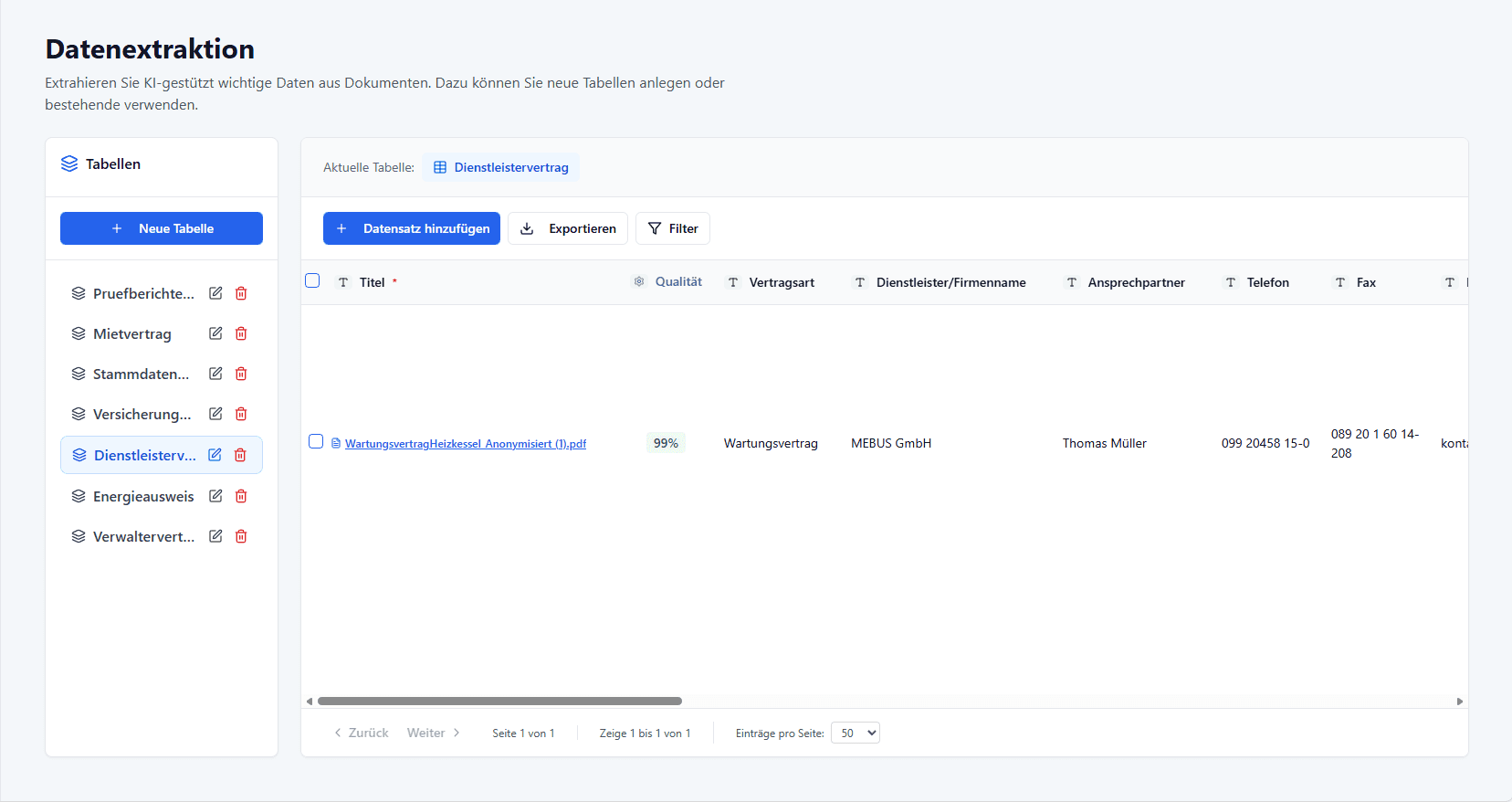 Unsere KI liest PDFs und gescannte Unterlagen, extrahiert Vertrags‑ und Objektdaten und überführt sie in ein einheitliches, durchsuchbares Format.